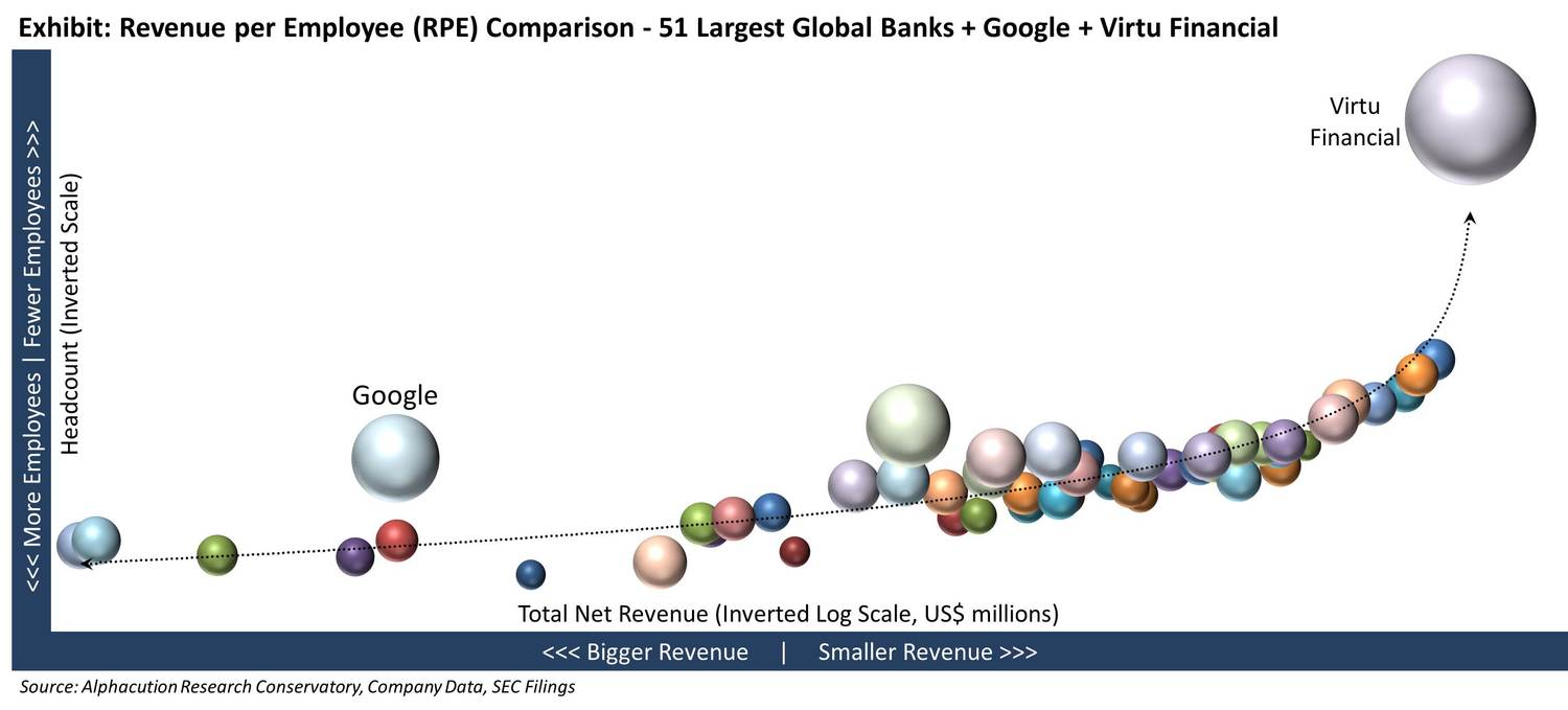 Furthermore, with this type of illustration, we can see which firms are above or below the benchmark given their scale – hence, the title of this introductory commentary: Can you defy your scale? At minimum, we can see which players generate the most revenue per FTE on both a relative and absolute basis. For instance, notable high-frequency trading (HFT) firms have very low headcount and generate exceedingly high RPE relative to all other members of the sample. We expect that this will remain true of the entire ecosystem once further modeling is complete.