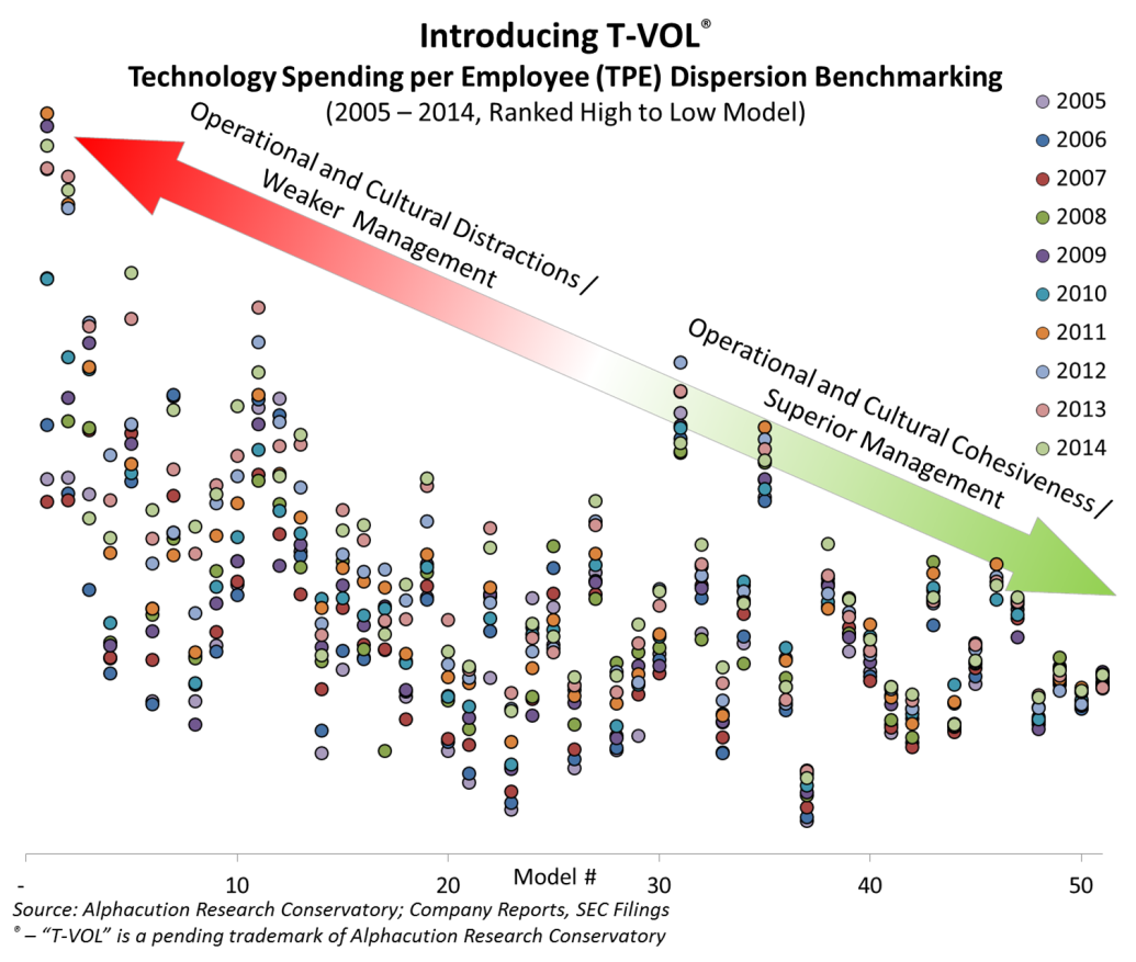 If it is true that IT strategy is business strategy, then the “volatility” of technology spending (which Alphacution has trademarked T-VOL™ as part of its suite of T-Greeks™) can provide incremental intelligence about the health and effectiveness of the enterprise (see Exhibit below).
