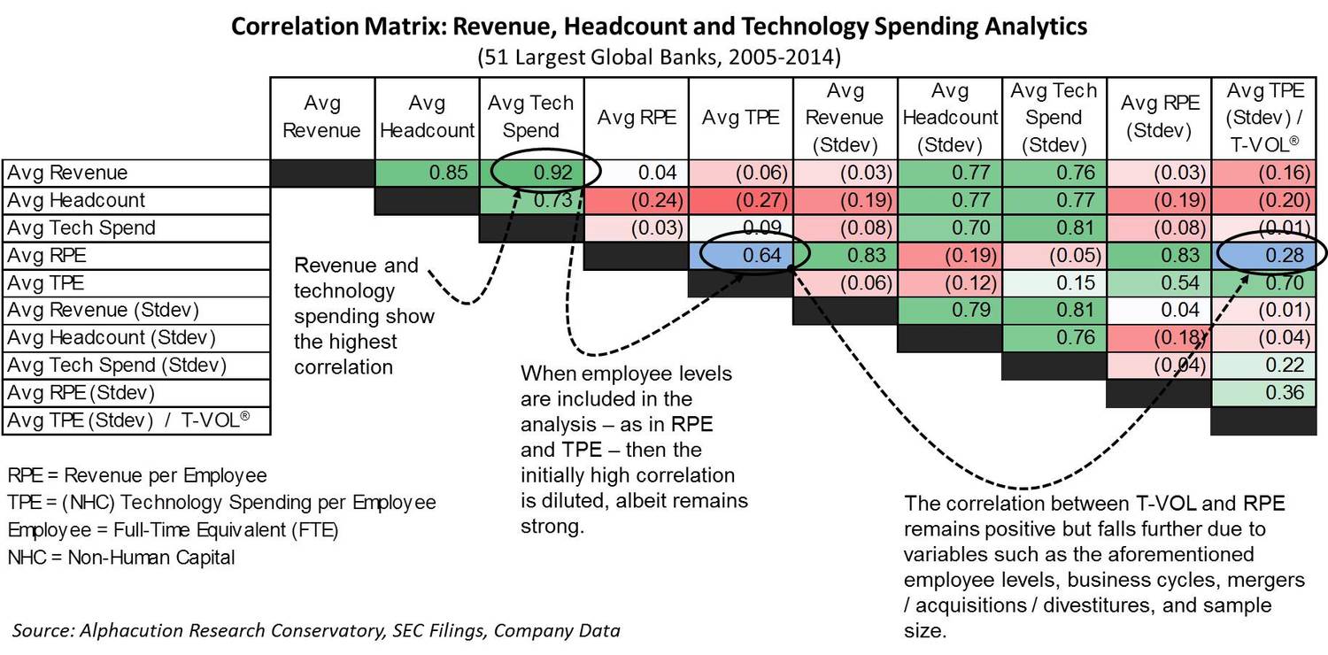 Technology spending – and derivative metrics like TPE and T-VOL and other members of our T-Greeks™ analytics suite (to be unveiled soon) – is never going to illustrate a direct and unimpeachable link to revenue all by itself, unless you are a highly specialized entity like a high frequency trading firm (and even then, personnel – the “players” – are going to make a critical impact). While comparisons of RPE and TPE / T-VOL demonstrate strong indications of operational effectiveness, large and highly diversified organizations, like global banks, have too many other variables that come into play.