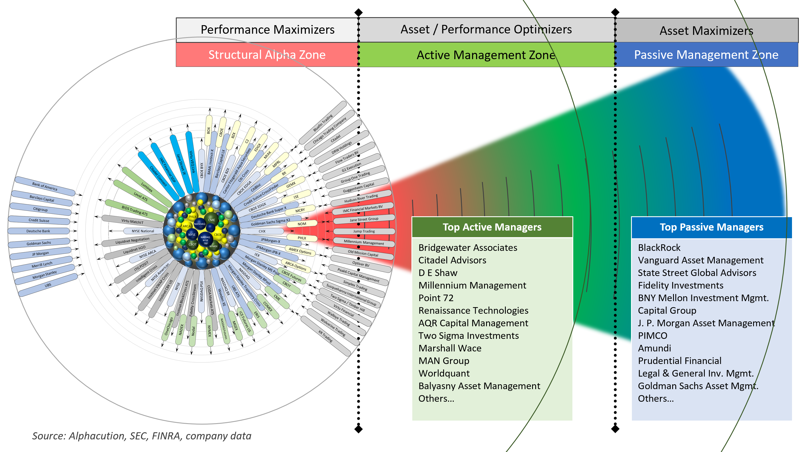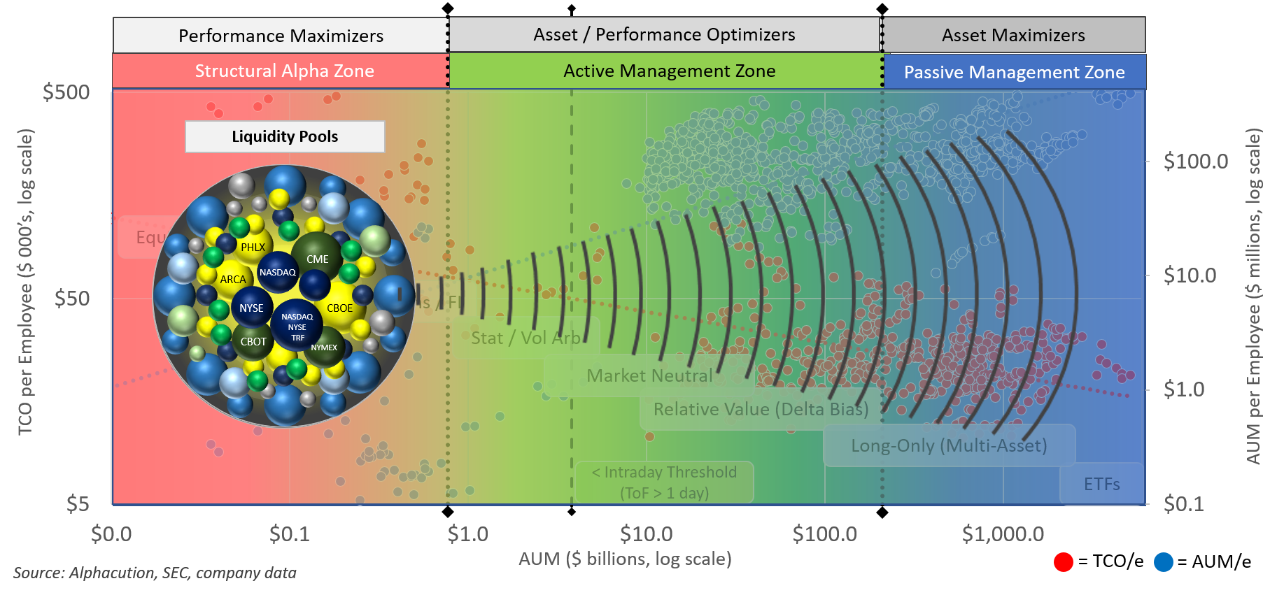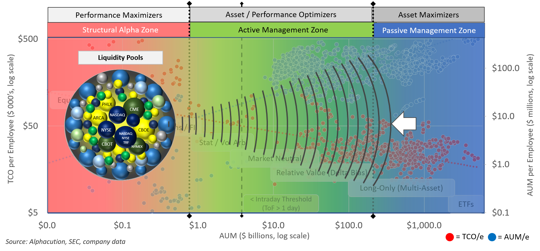 Now, let’s overlay the dynamic of incremental transaction and information transmission impacts on Alphacution’s asset management ecosystem map. In the exhibit below, we illustrate the sources of (listed) market liquidity in the structural alpha zone as the epicenter of information transmission in a strong form – as in, a point in time when there was less automation, liquidity fragmentation and dark liquidity:
