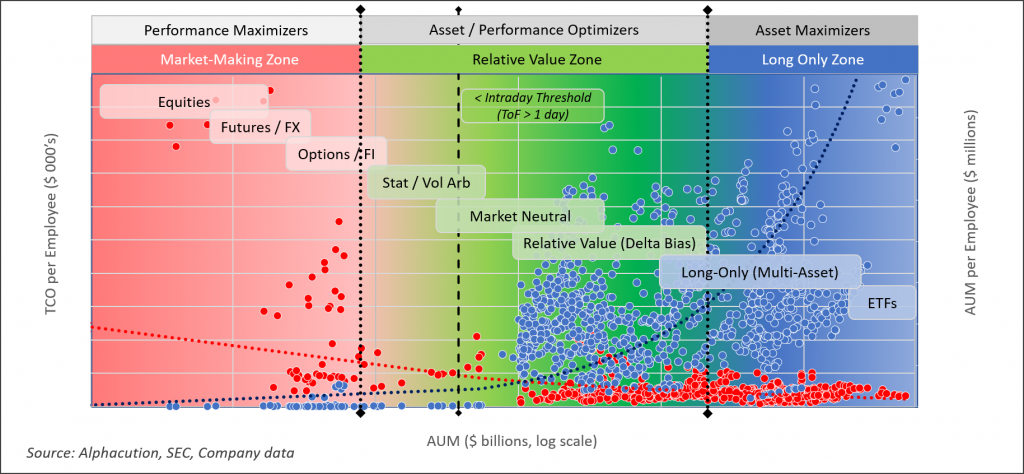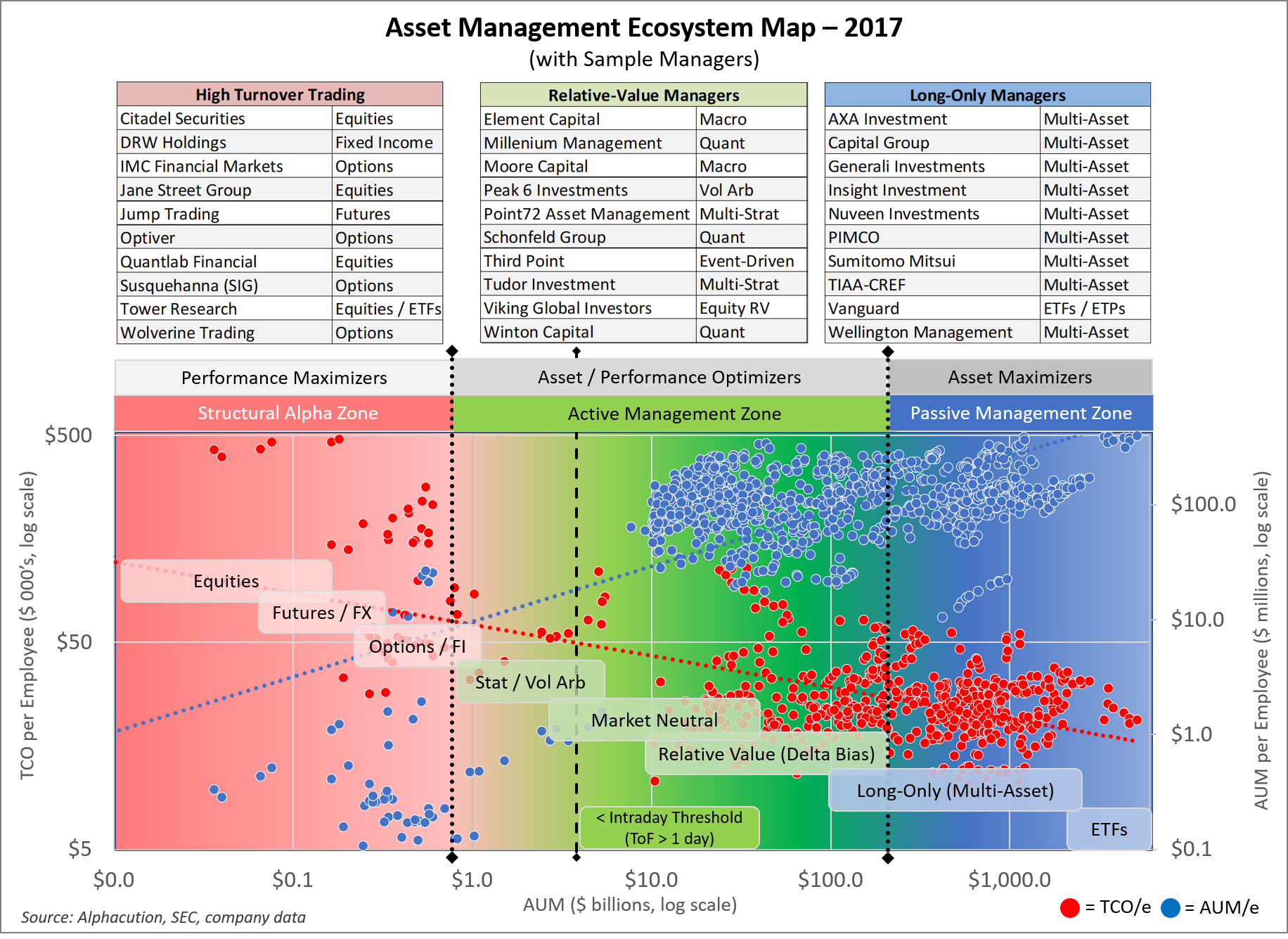AUM and strategy together provide empirical evidence to segment the map into 3 primary zones, now re-titled as structural alpha (formerly, market-making), active management (formerly, relative-value), and passive management (formerly, long-only) – with the combination of these last two including within them a spectrum of alternativeness.