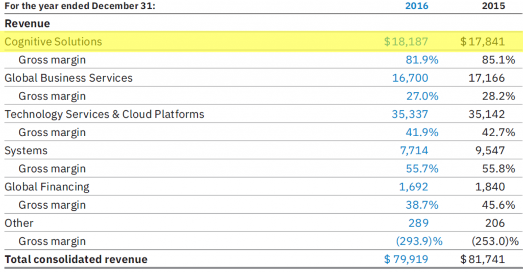 In 2016, IBM reorganized its segmented revenue table to include a new line in the top slot: “Cognitive Solutions.” In this new bucket was allocated more than $18 billion in revenue that had been carved out of the formerly generic and larger “Software” bucket from the 2015 segment taxonomy (see Exhibit below).