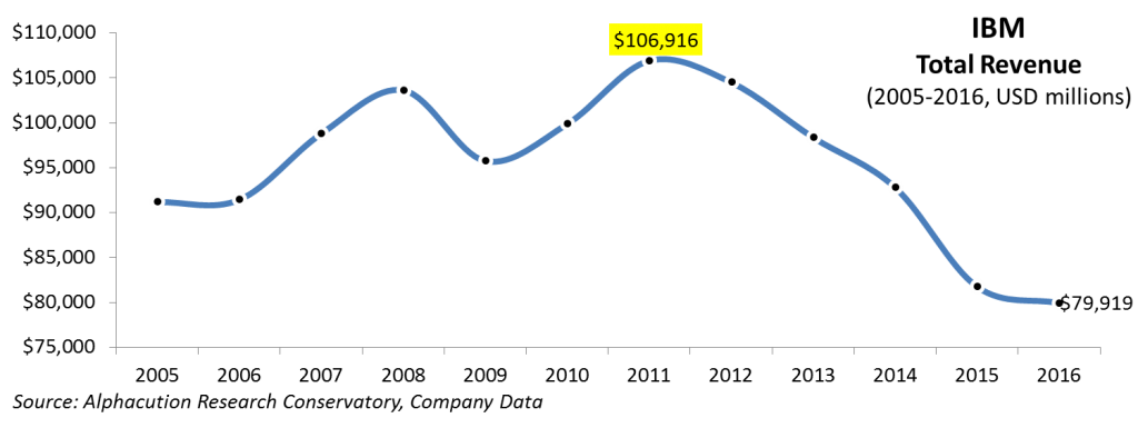 Ok, fine. But, that’s not the whole story. IBM – and others, like HP/E – need some wins. The past few years have been rough (for reasons to be elaborated upon later). The revenue line – that used to be supported much more solidly by the banking sector – is 5 years into a slide (see Exhibit below).