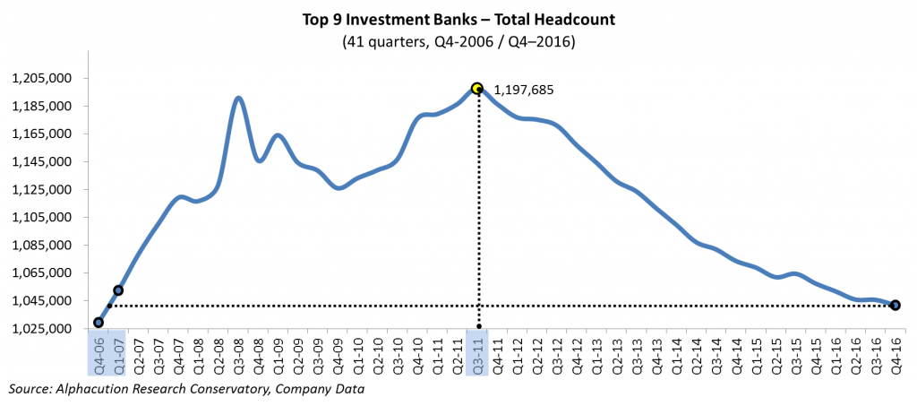 Anyway, for the Top 9 investment banks, total headcount is down 13% from its peak in Q3 2011. And, with at least 2 of the 9 – @Deutsche Bank and @CreditSuisse – reporting significant headcount reductions for the road ahead as part their year-end 2016 financial releases and 2017 guidance, it’s not much of a stretch for us to predict that the Wonkavator is highly likely to travel further back in time than year-end 2006 (see below).